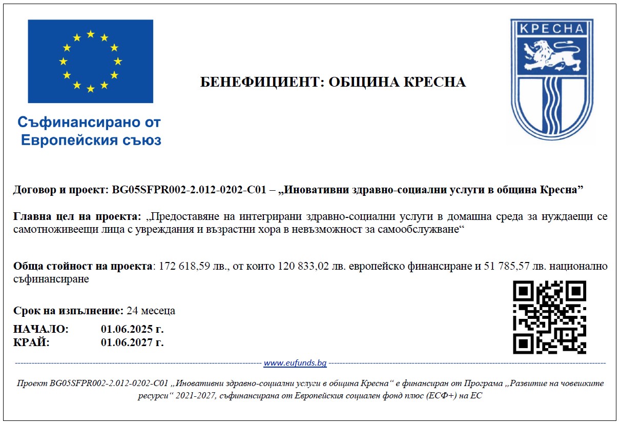 Община Кресна реализира проект „Топъл обяд в община Кресна“ Договор № BG05SFPR003-1.001-0033-C03, финансиран по Програма за храни и основно материално подпомагане 2021 –2027 г. съфинансиран от Европейски социален фонд плюс на Европейския съюз, Операция BG05SFPR003-1.001 „Топъл обяд“. Той стартира на 01.10.2022г. и е с продължителност до 30.09.2025 г. и обхваща 170 лица от целевите групи.